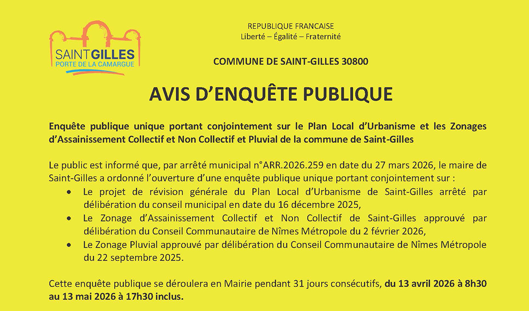 DU 13 avril au 13 mai 2026, la ville de Saint-Gilles met à disposition les pièces concernant la révision du Plan Local d’Urbanisme de la ville.